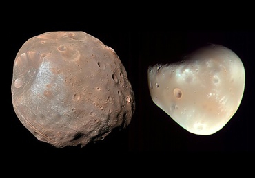 Okolo planety Mars obíhají dva malé měsíce nepravidelného tvaru, jež byly objeveny roku 1877 americkým astronomem Asaphem Hallem. Jak se oba měsíce jmenují?